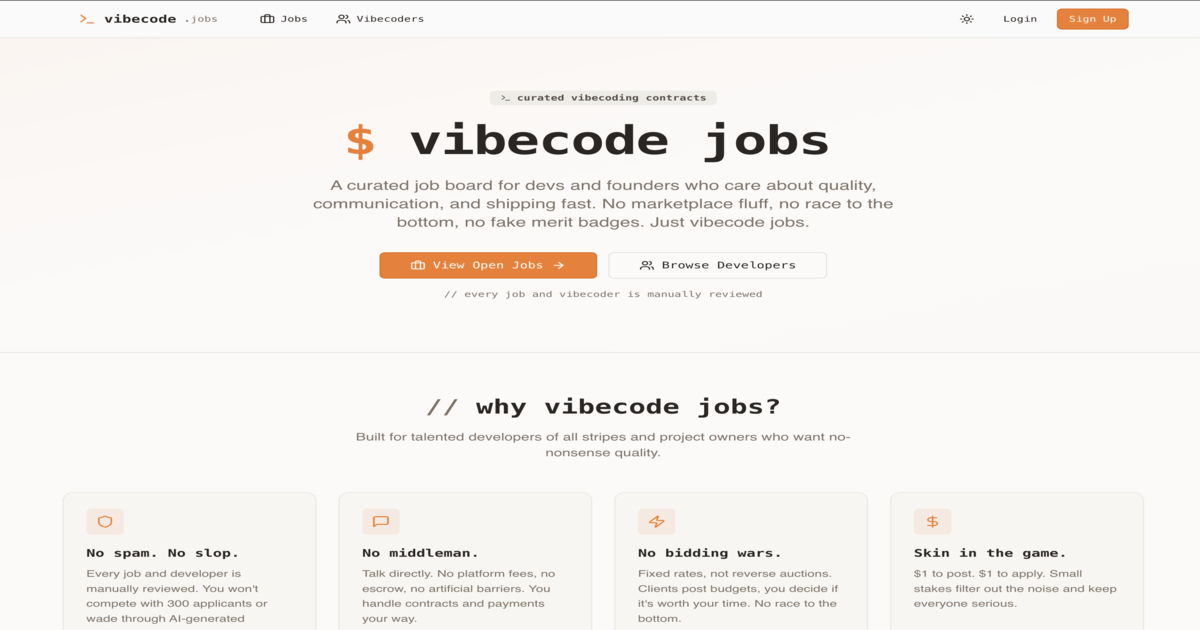 vibecodejobs.io is a curated marketplace connecting serious clients with vetted developers who build with AI-assisted coding tools. Every profile and job post is manually reviewed. No commission, no bidding wars — just $1 to post and $1 to apply. Direct connections between builders and buyers.
